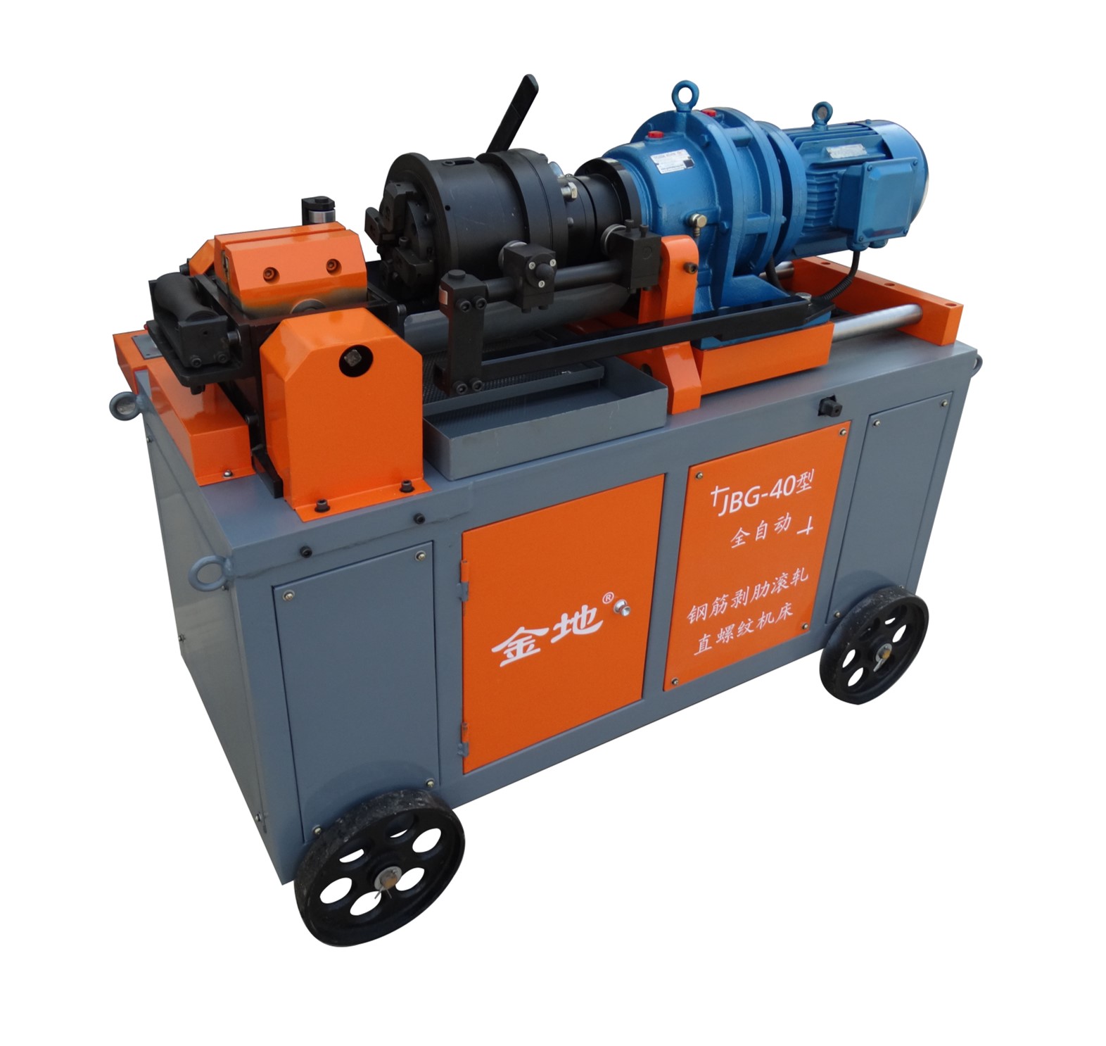 JBG—40型全自動(dòng)鋼筋剝肋滾軋直螺紋機(jī)床,采用PLC可編程控制系統(tǒng),氣動(dòng)夾緊、進(jìn)給,鋼筋的夾緊、剝肋、滾軋螺紋加工可實(shí)現(xiàn)一鍵操作。本機(jī)可加工正、反絲扣螺紋,且正、反扣螺紋的加工長度均能達(dá)到120mm。鋼筋剝肋,在直徑φ14—φ40mm范圍內(nèi)可利用剝肋盤自由調(diào)節(jié)定位。(如加工φ14mm、φ16mm鋼筋絲頭需在安裝刀片的4個(gè)刀體刀槽內(nèi)加裝1.8mm厚刀墊)。